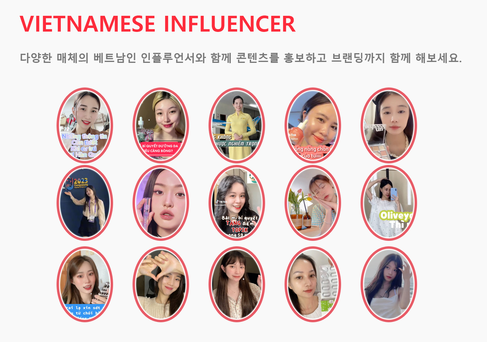 VKOL KOREA는 베트남인 인플루언서(KOL) 마케팅 대행 업체입니다. 한국의 여러 기업들의 우수한 제품과 서비스를 베트남 시장에 진출 할 수 있도록 발판을 마련해 드립니다. 베트남은 대부분이 페이스북과 틱톡을 사용하고 있고 인플루언서도 급격히 늘어나는 추세입니다. 다양한 베트남인 인플루언서들을 통해 고객의 비지니스 성공 파트너가 되겠습니다.